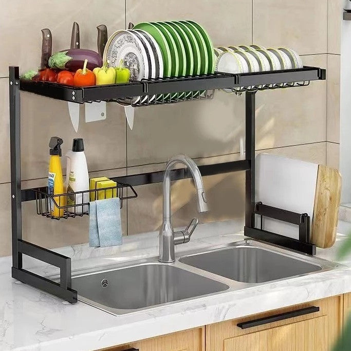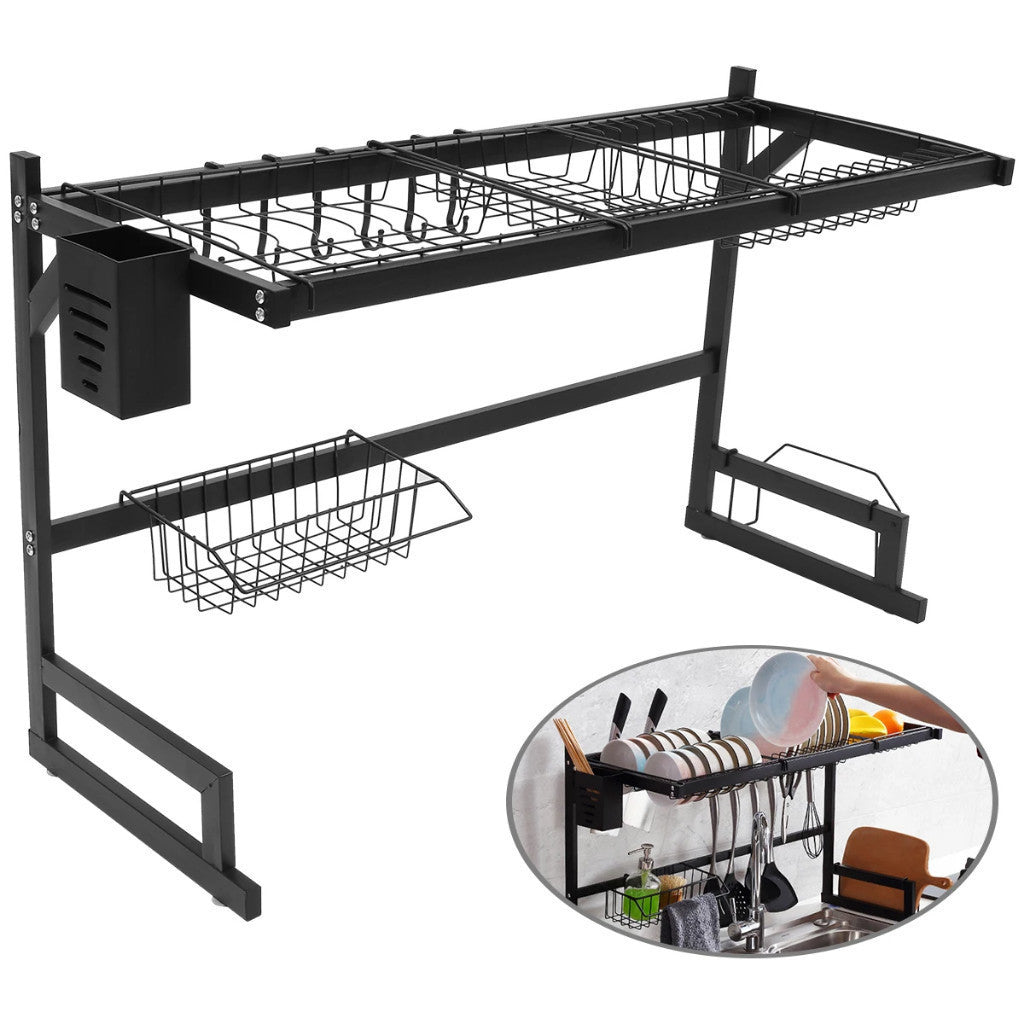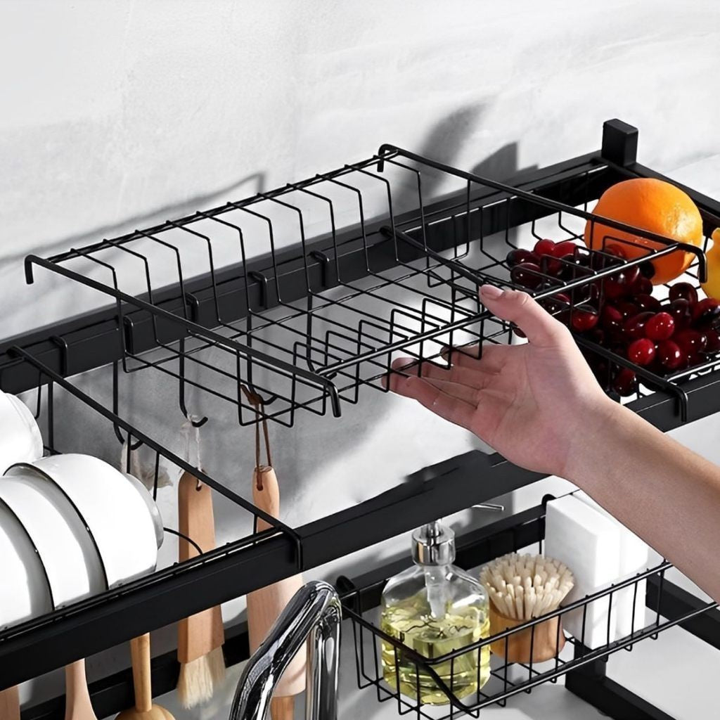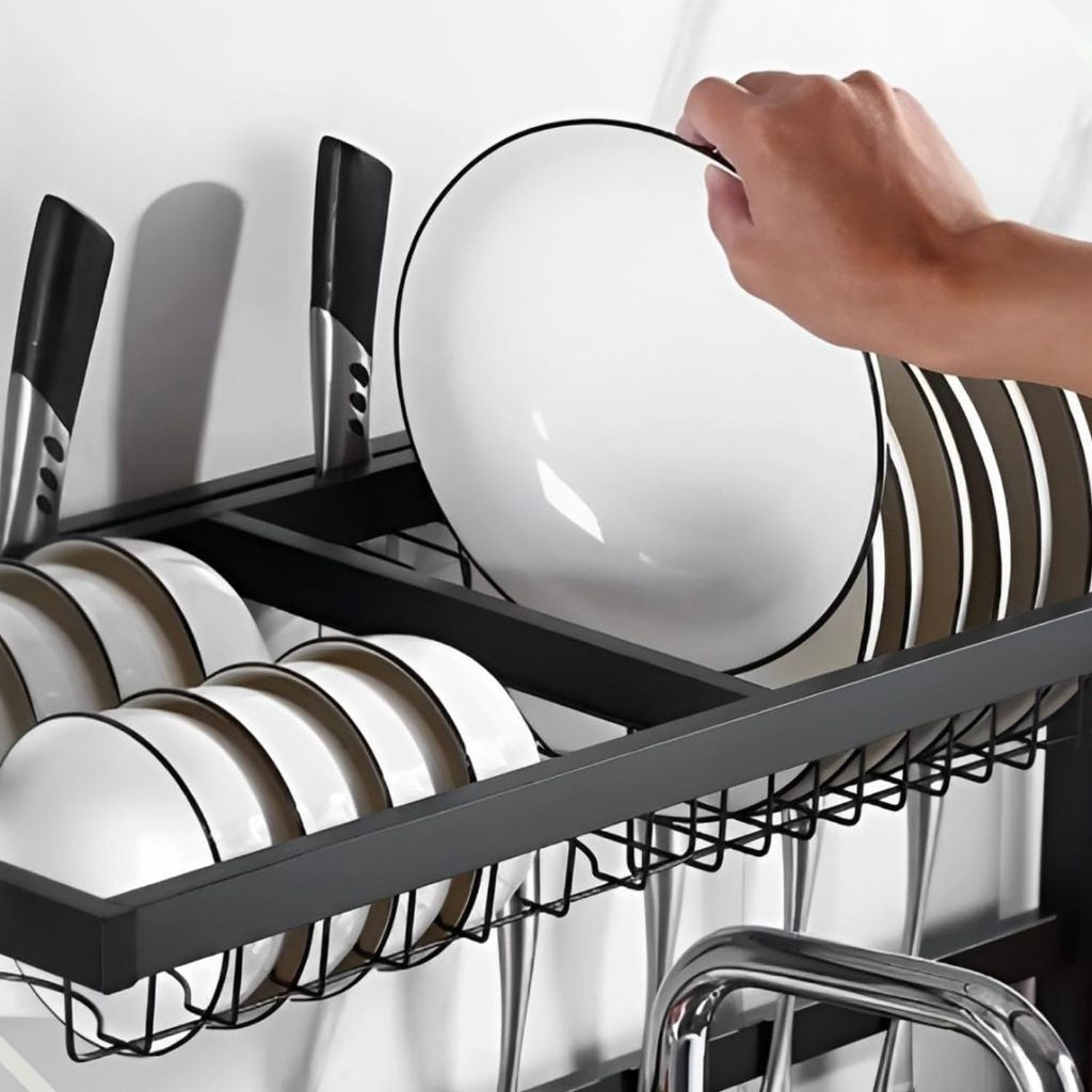 Escorredor de louça modular suspenso, fabricado em aço reforçado com pintura epóxi preta resistente à ferrugem. Ideal para cozinhas compactas e apartamentos, organiza pratos, talheres e utensílios sem necessidade de furar paredes.